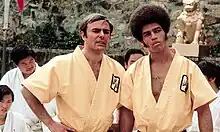Kelly was the first black martial arts film star. His first film role was a martial arts instructor in the thriller feature film Melinda (1972). He got it after being asked by the film's writer, to whom he was introduced by one of his karate students, to teach martial arts to its star, Calvin Lockhart.[11] Kelly then co-starred alongside Bruce Lee in the blockbuster, Enter the Dragon (1973).[12] He played Williams, a martial artist invited to a tournament run by crime lord and renegade Shaolin monk Han. The role was originally intended for actor Rockne Tarkington, who unexpectedly dropped out days before shooting in Hong Kong. Producer Fred Weintraub had heard about Kelly's karate studio in the Crenshaw district of Los Angeles, went there to see him, and was immediately impressed.[3] That film gave him his most memorable lines:[1][13]