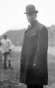 McAleer's tenure as part-owner of the Red Sox came to a swift end. On July 15, 1913, McAleer became involved in a dispute with the AL president, Ban Johnson, when McAleer forced the resignation of Red Sox manager Jake Stahl, one of Johnson's closest friends.[4] While McAleer claimed that he released Stahl because of a foot injury preventing Stahl from serving as a player-manager, rumors suggested that the two men had strong personal differences.[2] Following a bitter quarrel with Johnson, McAleer sold his holdings in the Red Sox. His feud with Johnson turned out to be a lifelong affair, despite efforts taken by their mutual friend, Charles Comiskey, to smooth over the rift.[5] While McAleer never publicly discussed the disagreement that spurred his retirement, he supposedly relayed his version of events to Frank B. Ward, a sports reporter with The Youngstown Daily Vindicator, with the understanding that the details remain confidential until McAleer's death.[5]