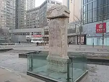 The name originated from one of the Eight Sights of Yanjing. Jintai Xizhao literally means The Golden Terrace in the Glow of the Setting Sun.[2] In 2002, a stone tablet of Jintai Xizhao written by Qianlong Emperor was unearthed under the Jingguang Building. The stone tablet was placed near the building now. The Beijing Subway station was named after the stone tablet when the first phase of Line 10 was opened in 2008.[3]