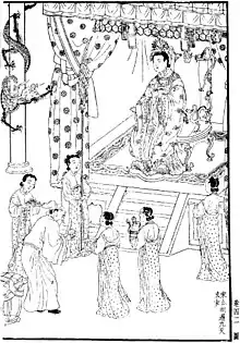 In the Ming dynasty, Jiutian Xuannü officially became a celestial protectress and was venerated as a tutelary goddess of the state.[11] In 1493, Empress Zhang (1470–1541), who was the wife of the Hongzhi Emperor, was ordained and her ordination was certified in a scroll entitled The Ordination of Empress Zhang, which contains numerous images of deities (but not Jiutian Xuannü) and an inscription composed by the Daoist master Zhang Xuanqing (張玄慶, d. 1509) of the Zhengyi school.[11] This inscription ranks Jiutian Xuannü above all other celestial warriors by placing her ahead of the divine categories Generals, Marshals, Heavenly Soldiers, the Six Ding Jade Maidens, and the Six Jia Generals.[11] Furthermore, it granted her the expanded official title Jiutian Zhanxie Huzheng Xuannü (九天斬邪護正玄女, translated "Dark Lady of the Nine Heavens who Slays Evil and Protects Righteousness").[11] The Lingbao Liuding Mifa associates the phrase "slaying evil and protecting righteousness" (斬邪護正) with the goddess and emphasizes that "in order to slay evil and return to righteousness, one first needs to know how to become invisible" (斬邪歸正,先須知隱形).[11]