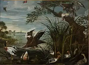 He travelled to Italy where he was recorded in Rome in the period from 1657 to 1665 and was known as 'Monsú Aurora'. He enjoyed high-level patronage in Rome as is demonstrated by the commission to decorate the Roman palace of Camillo Francesco Maria Pamphili.[4] He painted a large canvas and 38 smaller compositions depicting both dead and living animals, some set in marshy landscapes.[5] These formed part of a set of about 50 paintings with this theme, that Pamphili had commissioned, for educational as well as decorative purposes.[4]