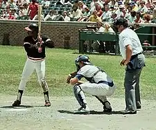 Davis made his major league debut on 21 April 1981 at the age of 24, and became the Cubs starting catcher as a rookie.[1] In the earlier years of his career, Davis showed promise on offense and became a fan favorite among Cubs fans.[3][4] In his second full season, 1983, he set what would turn out to be career highs with 151 games played, a batting average of .271 and 24 home runs. Davis also had 84 RBI in the same season.[1] In 1984, he set a career high with 94 RBI and earned his first All-Star selection, as the Cubs won the National League Eastern Division title, their first title of any kind since 1945.[1][5][6] In the only post-season appearance of his career, Davis hit .389 with 2 doubles, 2 home runs, 6 RBI and an .833 slugging percentage in the 1984 National League Championship Series as the Cubs were defeated by the San Diego Padres in a five-game series.[7]