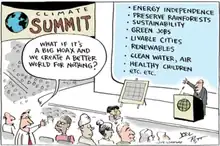 Pett is perhaps best known for his cartoon featuring an attendee at a climate summit asking What if it's a big hoax and we create a better world for nothing?. The cartoon, which first appeared in USA Today in December 2009,[3] around the time of the 2009 United Nations Climate Change Conference,[4] depicts a conference presenter listing the many advantages of curbing climate change including "energy independence, preserving rainforests, sustainability, green jobs, livable cities, renewables, clean water/air, healthy children, etc., etc.," only to have a climate change denier interject that if it were all a hoax, we'd create a "better world for nothing".[5] Shortly after the conference was over, Pett got a request for a signed copy from then-EPA administrator Lisa P. Jackson, who framed the comic and put it on her wall. Pett has repeatedly gotten requests from over 40 environmental groups, in the United States, Canada and Europe to use the cartoon in campaigns. The Australian Greens used it in a campaign which some have claimed was influential in the Australian parliament adopting a carbon pricing scheme under the Clean Energy Act 2011, said to be the most rigorous scheme in the world for the time it was active.[6]