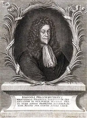 - 1 2 3 Johann Heinrich Zedler (compiler and original publisher (1735). "Frischmuth (Joh) ein berühmter Philogus zu Jena ..." Grosses vollständiges Universal-Lexicon. Referat Digitale Bibliothek (Bayerische Staatsbibliothek), München. p. 2139. Retrieved 30 December 2016.