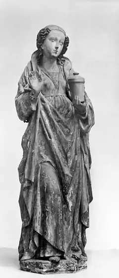 ![]() A carved wooden statue of Saint Mary Magdalene holding an ointment jar, taken aback at finding the tomb empty (c. 1480-1530, late Gothic-Northern Renaissance) | |