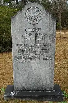 John Bond Jr. was born in 1770 to John Bond Sr. and Eleanor Peyton Bond in Beaufort, North Carolina.[1] In August 1793, Bond married his first wife, Adelphia Batson, in Burke County, Georgia.[1] By 1810, Bond had migrated to the Mississippi Territory in the vicinity of Marion and Covington counties.[2] Bond was the father of eight children by three wives: Adelphia Batson (m. 1793—d. 1819), Elizabeth Wails (also Wayles) (m. 1821—d. 1834), and Sarah Largent (m. 1840—1862).[1] Adelphia died from childbirth in 1819,[3] and Elizabeth died from unknown causes in 1834.