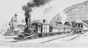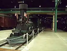 The locomotive remained on display in this location for nearly 80 years, but it was transported for display outside the museum on certain rare occasions. The most significant display in this time occurred in 1893 when the locomotive traveled to Chicago for the World's Columbian Exposition.[20] The Pennsylvania Railroad, like many other railroads of the time, put on grand displays of their progress; the PRR arranged for the locomotive and a couple of coaches to be delivered to the railroad's Jersey City, New Jersey, workshops where it would undergo a partial restoration to operating condition. The PRR was planning an event worthy of the locomotive's significance to American railroad history — the railroad actually planned to operate the locomotive for the entire distance between New Jersey and Chicago.[17]