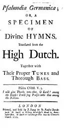 In 1722 Jacobi published the first edition of his Psalmodia Germanica, or a Specimen of Divine Hymns, Translated from the High Dutch, a collection of English translations of German Lutheran hymns. The dedication to the Royal Princesses Anne, Amalia and Carolina read, "The following sheets exhibit a translation of psalmody, used in the native country of your Royal Highnesses, which (as well as other protestant countries) is blessed with those spiritual hymns, to the frequent use thereof the Apostle doth so solemnly exhort." The Psalmodica also contained two works by Isaac Watts. Three editions of Jacobi's hymnbook appeared between 1722 and 1732. After his death a new edition was prepared in 1765, containing some new translations.[1]