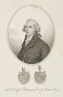 Stuart was born in Scotland in 1745 and began life there as John Smyth or John Ferdinand Smyth. He later wrote that he was the son of R. Wentworth Smyth, a gentleman who had fought in the Jacobite rising of 1715 and also the later one of 1745. According to Stuart's account, in 1744 his elderly father married Maria Julia Dalziel, a widow of fifteen, as his second wife. He reported that his mother was a granddaughter of General James Crofts, a natural son of the Duke of Monmouth, who was a son of Charles II, and that Wentworth Smyth was Monmouth's son by Henrietta Maria Wentworth, a daughter of Thomas, Lord Wentworth, and granddaughter of Thomas Wentworth, 1st Earl of Cleveland. Henrietta Maria had died in 1686, not long after Monmouth's execution, and Stuart said a Colonel Smyth, an aide-de-camp of Monmouth's, had adopted her son and made him his own heir.[1] Consequently, Stuart's father had grown up in France, from where he returned to Scotland at the time of the 1715 Rising.[2] Stuart stated in 1808 that he had been named for his godfather, Prince Ferdinand of Brunswick.[3]