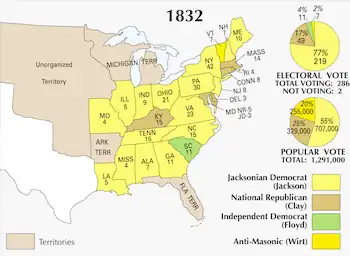 The presidential election of 1832 was approaching, and Floyd was torn: He wanted to see Vice President Calhoun as the presidential candidate but wondered if he should first be proposed as the vice presidential candidate for the second term. He felt Calhoun had a better chance to beat Jackson than Clay, and he wrote to Calhoun in April 1831 to know his opinion: "Under all these views I really do not know which course to take; whether to announce you a candidate for the presidency and take the hazard of war, or wait the fate of Clay. We would be glad to know your opinion about these things."[32] Floyd, along with Tazewell and John Tyler, were considered the leaders of the Virginians that had become disaffected with Jackson and had turned to Calhoun.[33] They felt that Jackson had repudiated "virtue and ability as well as Old Republican tenets."[33] According to historian Stephen Oates, "In Floyd's opinion, the federal government under "King Andrew" had usurped power left and right, thus allowing the majority to run roughshod over the minority."[31]