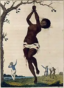 ![]() John Gabriel Stedman stands over a slave after the capture of Gado Saby, a village of Maroons in Surinam, from the frontispiece of his Narrative | |