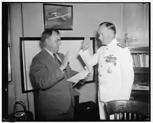 The newly appointed Chief of Bureau of Aeronautics, U.S. Navy, Rear admiral John H. Towers, right, being administered the oath on June 1, 1939