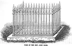 Hunt spent the last six years of his life in Viwa Island; despite his relatively young age and "iron strength", the rigours of missionary life nonetheless took a toll on his health.[20] Hunt died on 4 October 1848, at the age of 36. The cause of death was reportedly dysentery, which was common in Fiji at the time.[21][22] As he lay on his deathbed, in the company of his wife and James Calvert, Hunt exclaimed, "Lord, bless Fiji! Save Fiji!"[20] He then spoke his final words: "I want strength to praise Him abundantly! Hallelujah."[23]