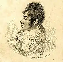 As a child he was taken to Paris by his mother, who had set up a school in the Champs-Elysées[2] He studied painting under François Vincent at the Tuileries, and was there at the time of the murder of the Swiss Guards on 10 August 1792, but escaped with his life. Masquerier made sketches from personal observation of many events of the French Revolution, such as the murder of the Princesse de Lamballe and the trial of the king. In 1793, when the arrest was imminent of all English residents in France, he and his mother tried to leave Paris. His mother was, however, arrested and imprisoned with Helen Maria Williams and others. She owed her life and liberty to the fall of Robespierre and the events of the 10 Thermidor.[3]