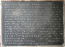 An inscribed tablet in his memory forms one of three similar forming part of the surviving elaborate monument erected by his grandson in St Saviour's Church, primarily in memory of his father Sir Thomas Ridgeway, whose semi-recumbent alabaster effigy is displayed. The Latin inscription is as follows: