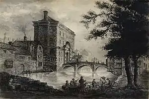 A presentment from the grand jury of the City and County of Cork, dated April 1698, found that "P. Murrough, titular Vicar-General and John Slyne (sic), titular Bishop of Corke, remain[ed] still in this kingdom, exercising ecclesiastical jurisdiction, contrary to" the Banishment Act.[9] As a result, in a letter he wrote to Cardinal Toussaint de Forbin-Janson "God at last permitted that I should he taken prisoner in my episcopal city".[57] Sleyne was imprisoned, pending immediate deportation, in Cork Gaol. (Cork Gaol was at that time located at South Gate Bridge[58] entrance to the city of Cork. The facility at the South Gate bridge subsequently became the debtors' prison in 1712, with North Gate bridge becoming the location of Cork Gaol thereafter). Sleyne was to be kept "in such rigorous confinement that he was not permitted to converse with any one".