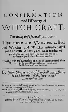 John Stearne (c. 1610–1670)[1] was an associate of self-styled "Witchfinder General" Matthew Hopkins, who was active during the English Civil War.[2] The duo's activities were heavily fictionalized in the 1968 horror film Witchfinder-General (U.S. title: The Conqueror Worm). Stearne was known at various times as the witch-hunter,[3][4] and "witch pricker".[5]