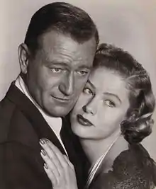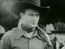 American actor, director, and producer John Wayne (1907–1979) began working on films as an extra, prop man and stuntman, mainly for the Fox Film Corporation. He frequently worked in minor roles with director John Ford and when Raoul Walsh suggested him for the lead in The Big Trail (1930), an epic Western shot in an early widescreen process called Fox Grandeur, Ford vouched for him.[lower-alpha 1] Wayne's early period as a star would be brief, as Fox dropped him after only three leads. He then appeared in a string of low-budget action films (mostly Westerns) before garnering more recognition with the 1939 film Stagecoach.