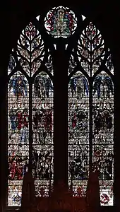 In 1907 the competition to design the first stained glass windows for Liverpool Cathedral was won by Powell's, and Brown was commissioned to design them. The first part of the cathedral to be built was the Lady Chapel and, as the chapel was dedicated to St Mary, the designs reflect the part that women have played in the history of Christianity.[3] On the staircase leading from the chapel to the main body of the cathedral are windows known as the 'Noble Women' windows that honour the contribution of women to society.[4] In 1921 Brown went on to design the large east window of the cathedral, which rises above its reredos.[lower-alpha 1] The design of the window is based on the theme of the Te Deum laudamus, with the risen Christ at the top, and below are four windows each representing one of the communities praising God.[5]