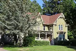 This two-story L-shaped Gothic Revival house has an elaborate front porch with channeled columns and ogee shaped braces in the three bays. It has a steep gable roof with trussing and verge-boards within the gable ends. Two first-floor bay windows are topped with bracketry. The windows are Gothic in character, with lancet shapes. The front entrance is through paired front doors with a colored glass transom above. An addition including a kitchen is attached to the rear of the house.[3]