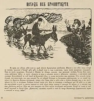 - ↑ "Во время оно случися смутъ велiй во граде некоемъ Кронштадтомъ именуемомъ. Матроси и иніи мужи мнози скокаху по стогнамъ градскимъ и убиваху другъ друга и резаху женъ со чады и домочадцы, тщася власти придержащiи испразднити. Оныя же власти предрожащiи Остелецкiй и Беляевъ во мундирiе облачении подъ кроватями нетленни, Господа Бога славословя, обретошася. Друзiи же власти офицерстiи во ризы и исподники женстiи и хулиганстiи облекошася, и сице животъ свой соблюдоша. Всечестнейшему же отцу Iоанну во Кронштедте сущу, се поликіи многочитіи чины притекоша: Отче всеблагіи, всетерпеливый, многомилостивый, чесо ради медлиши? Ты еси блудницу Порфирію во Богородицу хейротанисавый, ты еси піяницу горчайшего во Архангела Михаила претворивый, сътвори чудо: утиши брань и смутъ велій и скрежетъ зубовный, да бы и мы многогрешніи от него не пострадавша. Отвещав честный старецъ рече: Вас ли стонящихъ и мятущихся зрю? Не вкупе ли с вами азъ многогрешніи неисчестно с высоты амвонной ко сотне черной вопихъ, взывахъ и глаголахъ! Не матроси се, а любезные чада наша хулиганстіи мятутся! Духъ мой зело взыграяся ибо чуетъ избиеніе богомерзской интелдигенціи. Потеку на осляти ко чаду моему любезному во Питеръ градъ; "Кривошлыче, сладчайшій, возликуй со мной въ твоихъ Ведомостяхъ Градоначальства церкви и отечеству на пользу. Аминь" - Once in Kronstadt there was a mutiny. Sailors and other people ran around city streets and killed each other, and cut women with children and households, trying to overthrow the government. Representatives of the authorities: Osteletsky and Belyaev remained unscathed, as they lay under the beds in their uniforms and prayed to God. Other government officers dressed in women's clothes, or dressed like hooligans and thus saved their lives. Numerous people came to John, who was in Kronstadt, and addressed him with the words: "You are a father full of goodness, full of patience and always ready to promote the well-being of others. Why do you hesitate? You ordained harlot-Porfiria in Mother of God. You ordained bitter drunkard in Michael the Archangel. Make a miracle, calm down the war and a big rebellion, and a dental screech, so that we will not suffer". Honest elder answered: "Do not I see you groaning and restless? I am a sinner. I called out, yelled and addressed uncountable to the Black Hundred from the pulpit with you, is not it? These are not sailors, and our beloved children bully commit mutiny! My soul is indignant and feels that there will be a beating of the wicked intellectuals! I will run on donkey to my beloved son in St. Petersburg, where I'll tell him: "Krivoshlyk, sweetest, rejoice with me in your newspaper «Vedomosti of the St. Petersburg City Government and the Metropolitan Police» of the church and the fatherland for good. Amen.
