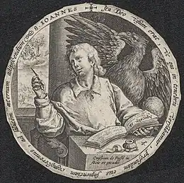 Legends from the "Acts of John" contributed much to medieval iconography; it is the source of the idea that John became an apostle at a young age.[32] One of John's familiar attributes is the chalice, often with a snake emerging from it.[40] According to one legend from the Acts of John,[41] John was challenged to drink a cup of poison to demonstrate the power of his faith, and thanks to God's aid the poison was rendered harmless.[40][42] The chalice can also be interpreted with reference to the Last Supper, or to the words of Christ to John and James: "My chalice indeed you shall drink."[43][44] According to the 1910 Catholic Encyclopedia, some authorities believe that this symbol was not adopted until the 13th century.[44] There was also a legend that John was at some stage boiled in oil and miraculously preserved.[45] Another common attribute is a book or a scroll, in reference to his writings.[40] John the Evangelist is symbolically represented by an eagle, one of the creatures envisioned by Ezekiel (1:10)[46] and in the Book of Revelation (4:7).[47][44]