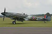 Johnson's wartime record was 515 sorties flown, 34 aircraft claimed destroyed with a further seven shared destroyed (three and one shared victories), three probable destroyed, 10 damaged, and one shared, destroyed on the ground.[9] All his victories were fighters. As a wing leader, Johnson was able to use his initials "JE-J" in place of squadron code letters. He scored the bulk of his victories flying two Mk IXs: EN398/JEJ in which he shot down 12 aircraft and shared five plus six and one shared damaged, while commanding the Kenley Wing; MK392/JEJ, an L.F Mk. IX, 12 aircraft plus one shared, destroyed on the ground. His last victory of the war was scored in this aircraft. Johnson ended the war flying a Mk XIVE, MV268/JEJ.[90] His post-war mount was MV257/JEJ; it was the last Spitfire to carry his initials.[91]