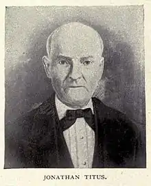 Jonathan Titus was born near Frankstown in Blair County, Pennsylvania. The area surrounding the Oil Creek Valley, now known as Titusville, Pennsylvania, was first settled by white Americans in 1797 by Jonathan Titus and his uncle Samuel Kerr, who were involved in the early planning of the community.[1][2] Plans for a community were created and Titusville soon became established. Several families moved to the area as westward expansion of the United States was becoming more common. Jonathan married Mary Martin and raised a family in the early years of Titusville. He died in 1857.
