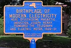 Historical marker in Academy Park in Albany commemorating Henry's work with electricity