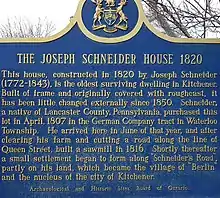 - ↑ "Joseph Schneider Haus Historical Plaque". ontarioplaques.com. Retrieved 30 September 2018.