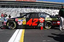 Montoya drove the No. 42 CGR Dodge in 17 Busch Series races in 2007 to gain experience on tracks where he also competed in the Cup Series.[116][117] He led a race-high 43 laps in the Telcel-Motorola Mexico 200 at the Autódromo Hermanos Rodríguez before bumping his CGR teammate Scott Pruett with eight laps remaining for his first NASCAR victory and become the first foreign-born NASCAR winner since Ron Fellows in 2001.[118] Montoya finished two more races in the top ten, at Atlanta and Talladega, and his best start of the season was second at Watkins Glen International, where he finished 33rd following a crash.[116] He drove for CGR in the renamed Nationwide Series for two rounds late in the 2008 season, finishing outside the top ten in both races.[119][120]