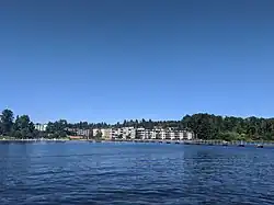 Juanita Beach Park is a 22-acre (8.9 ha) waterfront park located on the northeast shore of Lake Washington in the Juanita neighborhood, managed by the city of Kirkland, Washington in the United States. It was historically the home of several popular private beach resorts before their purchase by the public in 1956. The park straddles thoroughfare Juanita Drive and features a number of amenities, including a pier, a playground, bathhouses, and athletic facilities.[1] It is the busiest waterfront park in Kirkland's recreation system.[2]