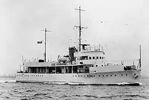 Judy also pointed out the approach of hostile Japanese aircraft long before any of the human crew could hear them. This first occurred prior to the outbreak of war, when the aircraft would fly low over Gnat with Judy barking at them until they had passed.[22] On an outing to Jiujiang, Jefferey took Judy for a walk outside of the city but she ran ahead, pulling him with her. He realised as he looked back that she had been pulling him away from a leopard.[23] In November 1937, Gnat met with the American river gunboat USS Panay. After Panay held a party for the two ship's companies, Gnat crew departed and only realised afterwards that Judy was not with them. They contacted Panay via signal lamp, but they insisted that they had not seen her.[24] The following morning, the crew heard from a Chinese trader that Judy was aboard Panay after all. In retaliation, a party boarded the American vessel and stole the ship's bell. Afterwards they contacted Panay and offered them the bell back in return for Judy. She was returned within the hour.[25]
