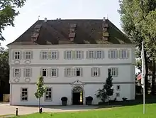 • The Köngen Palace was first constructed in 1392 as a castle by the local lord, the Free Imperial Knight Hans Thumb von Neuburg. The Neuburg still exists today as a ruin north of Chur in Grisons. Already in 1398 the castle was expanded to a water castle with four wings. In 1520 the castle was heavily damaged by troops of the Swabian League. Therefore, an almost entirely new construction was built after 1520. The castle changed into a Renaissance palace. During this construction the great hall was expanded in 1538, which has survived almost unchanged up to today. The changes took almost the entire 16th century. Heinrich Schickhardt mentioned in his catalogue that he had built a gate house at the palace around 1600. It was torn down together with two wings during the changes made by Jakob Friedrich Weishaar. Weishaar bought the estate in 1825 and let it be changed according to his needs. Up to the 1930s it was a place for culture. Here the youth association "Bund der Köngener" was established. The painter Christian Mali and the Dutch-German painters family Peters stayed often in the palace. During the last few years, frescos from the 18th century on the eastern wall of the great hall have been uncovered and restored. They show figures out of antique mythology and history.[13]