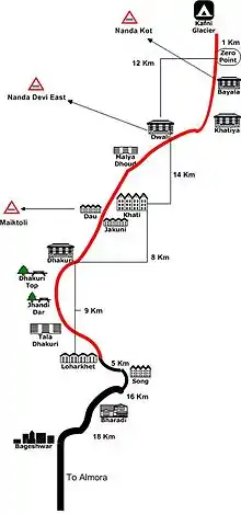 The glacier is located in Bageshwar district. From Bageshwar town it can be approached via route of Bharadi, Saung, Loharkhet, Dhakuri Pass, Khati, Dwali and Khatiya. The route until Loharkhet is motorable, after which it is approximately a 90 km (56 mi) round trip. Khati is the last village on the route. Though Pindari is more popular tourist destination, some people find route to this glacier more beautiful. Unlike Pindari, tourists can trek up to the glacier. In case of Pindari, the trek beyond zero point becomes very tough and cannot be done without proper equipment.