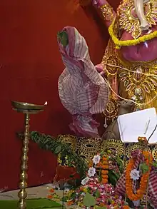 On the first day of Durga Puja the Kola Bou is draped with a red-bordered white sari and vermilion is smeared on its leaves. She is then placed on a decorated pedestal and worshipped with flowers, sandalwood paste, and incense sticks. The Kola Bou is set on Ganesha's right side, along with other deities. For most who view her, the new sari indicates her role as a new bride, and many Bengalis see it as symbolizing the wife of Ganesha.