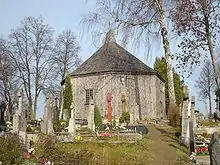 The chapel is surrounded by many very old, historical and artistic graves around the chapel, marked with metallic crosses and other gravestones. A high stone obelisk for Dionizas Poška stands near the chapel. Poška was a great poet and founder of the Baubliai museum, the first history museum in Lithuania. Marijona Stulginskienė (Aleksandras Stulginskis's mother) is buried on the southeast side of the graveyard hill.