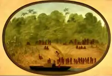 Samuel Fritz and other missionaries began concentrating the scattered indigenous communities into Jesuit reductions in order to facilitate religious indoctrination and protect them from enslavement by the Portuguese, but smallpox devastated the population, leaving the region of the upper Solimões uninhabited.[7] In 1745 Charles Marie de La Condamine wrote in his Relation abrégée d'un voyage fait dans l'intérieur de l'Amérique Méridionale,[16][17] that of the 30 Omagua villages marked on Fritz's 1707 map, he saw only ruins, adding that "all the inhabitants, frightened by the incursions of a group of bandits from Pará, who came to enslave them in their own lands, dispersed into the forest and the Spanish and Portuguese missions."[17] Throughout the eighteenth century and until slavery was officially outlawed in Brazil in 1888, forced labor programs destroyed indigenous communities, compelling the natives to abandon their ethnic traditions and adopt the identity of caboclos (settlers of mixed race).[1] By the late 1980s, it was assumed by many ethnographers such as Betty Jane Meggers that the Cambeba were extinct.[18]