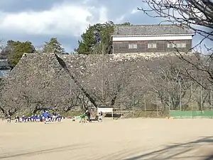 In 1636, Honda Toshitsugu received permission to build a yagura on the raised base of the former tenshu. Named the "Tamon-yagura", this is one of the few surviving structures of the castle and was declared a historic site by the prefectural government in 1953.[2] In 1873, as per government decrees following the Meiji Restoration, most of the remaining castle structures were demolished.[3] One survivor is the entrance to the Ni-no-maru daimyō residence, which is incorporated into the main hall of the temple of Tensho-ji in the Nishimachi neighborhood of Kameyama.