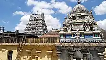 The temple is located 21 km away from Kumbakonam on the Kumbakonam- Tiruvaiyaru- Tanjore road. The temple is 2 km away from Tiruvaiyaru and located in the heart of Thirukandiyur.[2] Kandeeswarar has a five-tiered rajagopuram and a west-facing sanctum. The sanctum lies axil to the temple gateway and the flag staff, which is located after the gopuram in the second precinct. The shrine of Ambal is south facing and she is sported in standing posture. There are shrines of Vinayagar, Murugan with Valli & Deivanai, Mahalakshmi and Vishnu Durgai. The images of Brahma, Lingodhbhavar and Dakshinamurthy are located in the planks around the sanctum. The sanctum is guarded by Dvarapalas and the image of sage Sathapatha is depicted in the nearby wall. In the halls in the first precinct, there are images of Sapthastana lingas and Panchabhoota lingas. There are small images of Brahma and Saraswathi near the sanctum.[3] The temple is one of few places where there is a separate shrine for Brahma.[4]