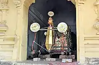 The sapthasthanam festival is conducted at Tiruvaiyaru during April every year. As per Hindu legend, it is the wedding festival of Nandikeswara, the sacred bull of Shiva on the Punarpoosa Star during the Tamil month of Panguni.[9] The festival deity of Aiyarappar temple of Thiruvaiyaru is carried in a decorated glass palanquin along with the images of Nandikeswara and Suyasayambikai to the temples in Thirupazhanam, Thiruchottruthurai, Thiruvedhikudi, Thirukandiyur and Thirupoonthurthi. Each of the festival deities of the respective temples mounted in glass-palanquins, accompany Aiyarppar on the way to the "final destiny", Thillaistanam. There is a grand display of fireworks in the Cauvery Riverbed outside Thillaistanam Temple. The seven palanquins are carried to the Aiyarappar Temple in Thiruvaiyyaru. Hundreds of people witness the convergence of seven glass-palanquins carrying principal deities of respective temples from seven places at Tiruvaiyaru. The devotees perform Poochorithal (flower festival) in which a doll offers flowers to the principal deities in the palanquins. After the Poochorithal, the palanquins leave for their respective temples.[10][11]
