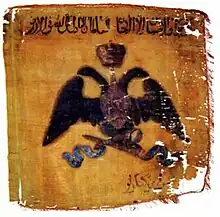 During the entire campaign of 1829, the Kangarli Cavalry mainly operated as part of the consolidated Cossack regiment and participated in the Oltu expedition of Lieutenant Colonel Prince M. Z. Argutinsky-Dolgorukin's detachment as an independent unit only on September 18–20. The siege of the Oltu fortress and its subsequent firing led to the surrender of the fortress garrison. Kangarli cavalrymen, who were in the vanguard of the detachment, became more prominent in the battle of Milli-Duz.[12] All Transcaucasia Muslim cavalry regiments, including the Kangarli cavalry, were awarded with commemorative flags on October 26, 1830, for their distinction in the battles of 1829. According to the order of Nicholas I, Kangarli cavalrymen were given an honorary flag for their bravery, the State Coat of Arms and the monogram of Nicholas I were depicted on its green fabric.[2] There is a flag in History Museum of Azerbaijan belonging to a detachment of the Kangarli cavalry.[3] Researches show that the flag of the Kangarli Cavalry was transported to the palace of Ehsan Khan under the personal leadership of the Caucasus Governor - Field Marshal Prince Mikhail Semenovich Vorontsov (1782-1856).[1]