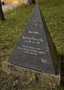 His memory was honoured in August 2019 by the Raoul Wallenberg Foundation, which designated the Motesiczkys’ former property at Hinterbrühl as one of the ‘Houses of Life’ to acknowledge the sacrifice that Karl Motesiczky and his companions made in sheltering those fleeing from or resisting Nazism.[13] The property was restituted to his mother and sister after the war and sold by them in the mid-1950s to SOS Kinderdorf,[2] an international charity that runs a chain of ‘villages’ worldwide for humanitarian work with children. His mother and his sister also arranged for a memorial to be built there for Karl in 1961. Motesiczky's memorial was destroyed in summer 2000 and defaced with swastikas so it had to be restored. In 2007, a Stolperstein was placed in front of the main building of the SOS-Children's Villages.[14]