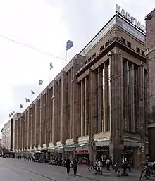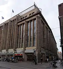 The Landesamt für Denkmalpflege Bremen (LfD), the Department for Preservation and Protection of Historical Buildings, describes it as a five-storey building with a concrete frame, faced with a coarsely embossed surface of Ettringen tuff.[3] Its architecture is considered representative of the department store style of the second and third decades of the 20th century. Together with the Nordwolle building (“Haus des Reichs”) and the concert hall "Die Glocke", it a prime example of architectural development in the city of Bremen between the two wars, notable above all for its particularly modern look.[2] Philipp Schaefer had developed an architectural language which was not only consistent but also convincing in a formal sense.[4]