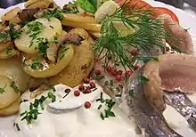 Sahnehering Main course Young herring marinated in cream, with onions and sometimes pears or apples and served with Bratkartoffeln or Pellkartoffeln.