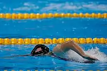 On the meet's final day, Ledecky set her fifth world record of the year, lowering her record in the 1500-meter freestyle by nearly six seconds with a time of 15:28.36. Ledecky swam the second half of the race faster than the first, completing the final 800 meters in 8:14.11—faster than any other woman has completed a regular 800-meter race in a textile suit.[46] Ledecky lapped three competitors in the final and finished 27.33 seconds ahead of silver medalist Boyle. National Team Director Frank Busch described Ledecky's 1500 performance as "the most impressive race I have ever seen, and I've been in the sport for 50 years.... She's blazing a completely different trail than anyone who has come before."[22]