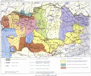 The administrative subdivisions of the ASSR changed several times in its history. In 1928 the guberniyas, administrative districts inherited from the Kirghiz ASSR were eliminated and replaced with 13 okrugs and raions. In 1932, the republic was divided into six new larger oblasts. These included: