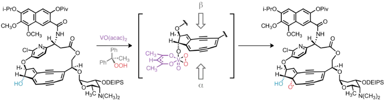 In targeting 10-epi-kedarcidin chromophore, Myers et al. sought to install the epoxide functionality syn to the adjacent C10 hydroxyl group. This was accomplished by vanadium-catalyzed epoxidation directed by the C10 hydroxyl group.[9] Had the natural C10-(S)-epimer been desired, it is conceivable that trialkylsilyl protection of the C10 hydroxyl would lead to the desired α-face epoxidation product by steric occlusion of the β face of the olefin; however, without a directing group to accelerate the oxidation of a proximal alkene, this hypothetical reaction would likely suffer from poor regioselectivity, as oxidation of other C–C unsaturations in the molecule would compete with the desired reaction.