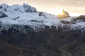 Kejulik Volcano, also known as Mount Kejulik or the Kejulik Pinnacles, are highly eroded remnants of an andesitic stratovolcano located in the southwestern Kejulik Mountains within the Aleutian Range near Becharof Lake.[1] The volcano lies on the border of Katmai National Park and Preserve and the Becharof National Wildlife Refuge, about 30 miles (48 km) southwest of Mount Katmai.[3] Little information is available regarding Kejulik, according to the Alaska Volcano Observatory, and any possible volcanic activity is currently unknown.[1]