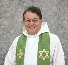 ![]() Portrait of Ken Howard, wearing a stole featuring both Christian and Jewish symbols (taken 2012). | |